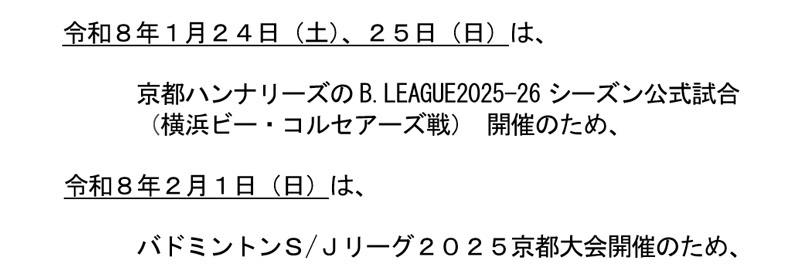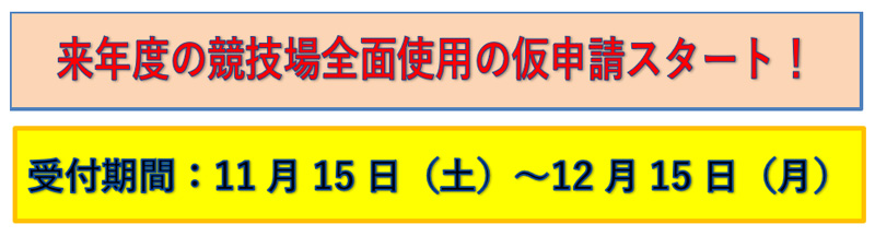 島津アリーナ京都では、より多くの方に公平かつ効率的に体育館をご利用していただくため、来年度の競技場の全面使用については、今年度にご利用希望日の「仮使用申請書」を提出していただき、事前に大会等の年間調整を行い、使用日等の仮決定を実施しております。